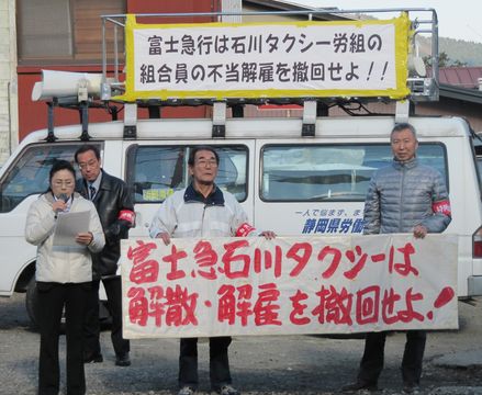 石川タクシー労働組合の諏訪部委員長は、「一方で富士宮の首を切りながら、富士急からの出向の共通の社長をいただく石川タクシー富士は、新聞に求人広告を出している。これを見てもこの解雇が組合つぶしを狙ったものであることがわかる。富士急本社は団体交渉に応じてほしい」と訴えました。