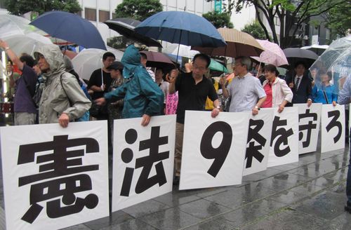 静岡市の青葉公園には雨の降る中、県内の弁護士はじめ市民が「憲法9条を実現し、平和な世界をつくろう!」「ストップ戦争する国づくり」「憲法9条を守れ」などの横断幕を掲げ約300人集まりました。静岡県弁護士会の大石康智会長は、昭和22年発行の憲法普及会編「新しい憲法明るい生活」の一文「 日本国民がお互いに人格を尊重すること。民主主義を正しく実行すること。平和を愛する精神をもつて世界の諸国と交りをあつくすること・・・」を読み上げ憲法を守らなくてはならないと訴えました。
